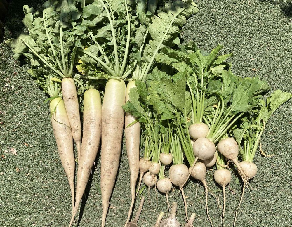 大根、カブはまだまだ大きくなりそうです。ニンニク🧄ちっちゃい😩