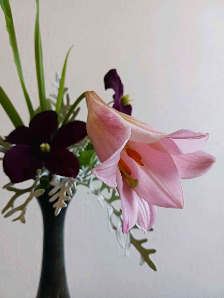 添えもののクレマチスが暗い色で、花器も暗かったので間にシロタエギクを挟んだのですが、、、やはり暗かったかと🤔