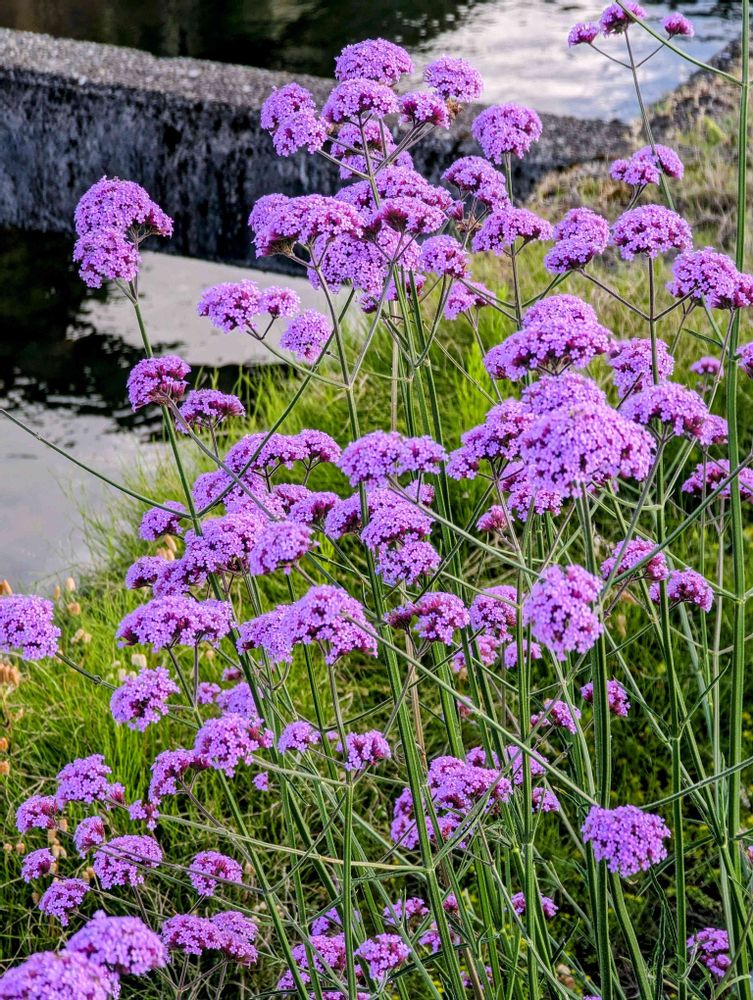 用水路端で風に揺れるチガヤの中に三尺バーベナが咲いていました💜