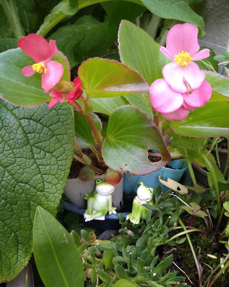 1、2枚目は手作りカエル🐸と八重咲きベゴニア。沢山お花が咲きました。