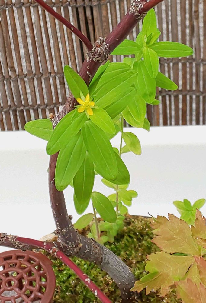モミジの盆栽「赤いオバケちゃん」の鉢に生えている小さいオトギリソウの仲間に花が咲きました!🤗💕