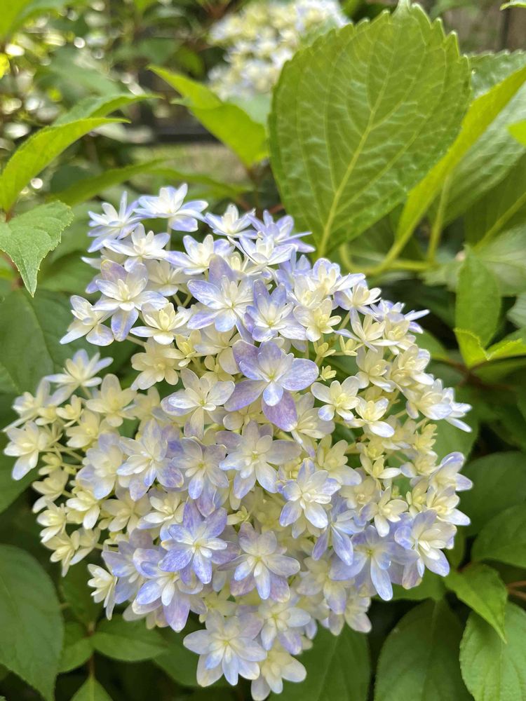 紫陽花・万華鏡💠地植えで数年…背は大分大きくなりましたが、ヒョロくて白覆輪も見えない。課題が多いなー(´-ω-`)ウーン、、、