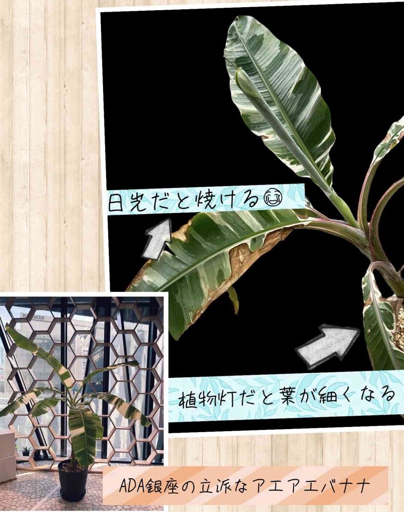 斑入りバナナ🍌アエアエ、日光だと葉が焼け、植物灯だと光量不足で葉が細く・・ADA銀座にあったアエアエ🍌のような綺麗な葉にならず泣いてる😭