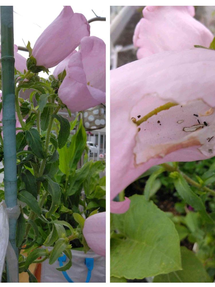 4枚目ピンク色カンパニュラ、虫が穴を開け可哀想な姿もあった