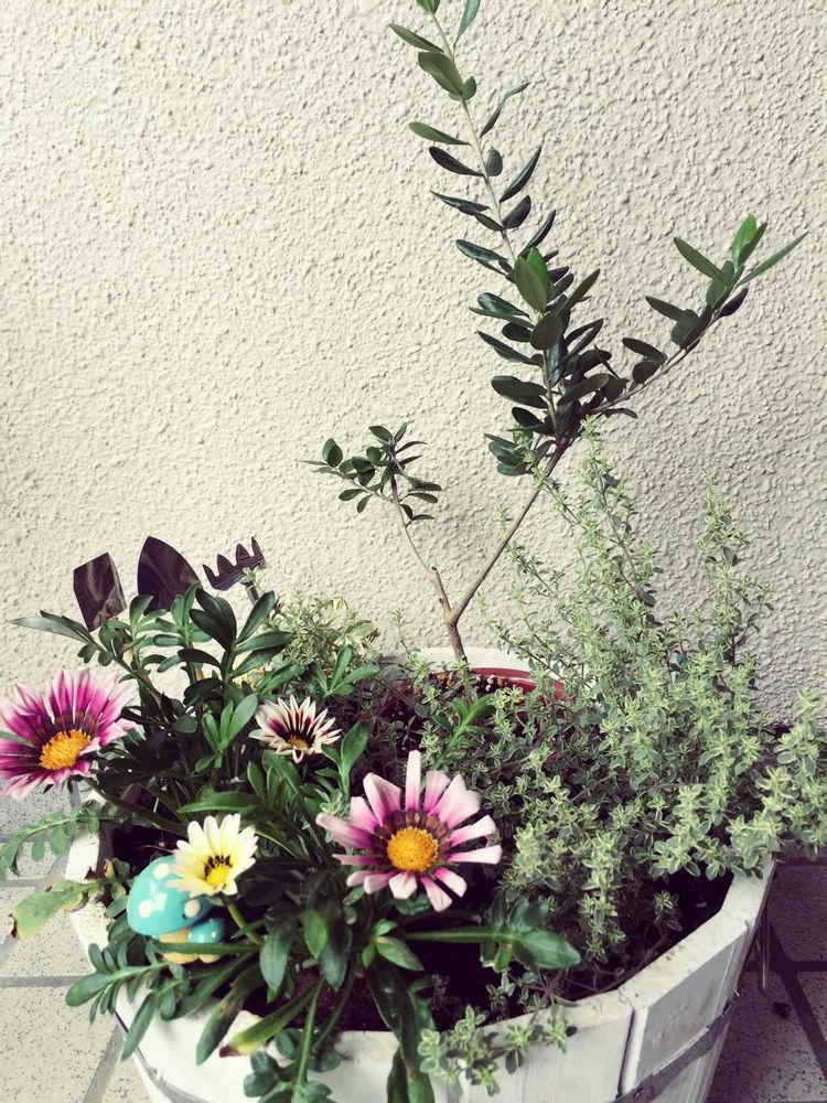 バラが咲き終わりだったので樽鉢にガザニアとシルバータイムと一緒に寄せ植え(オリーブは鉢ごと)♪
