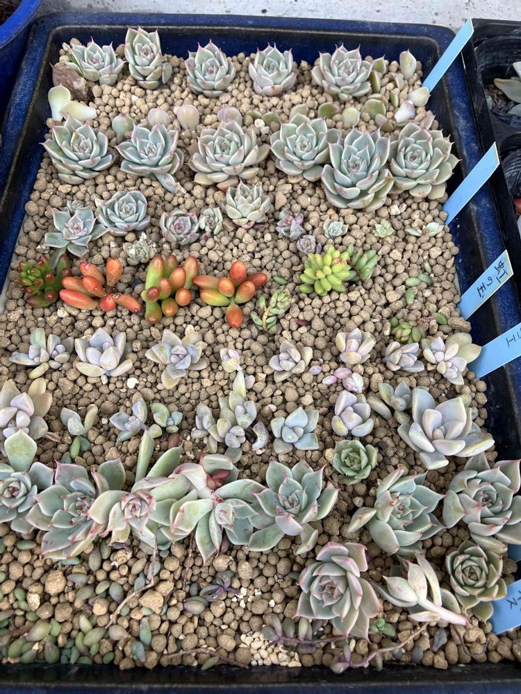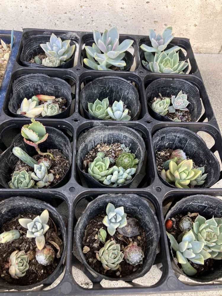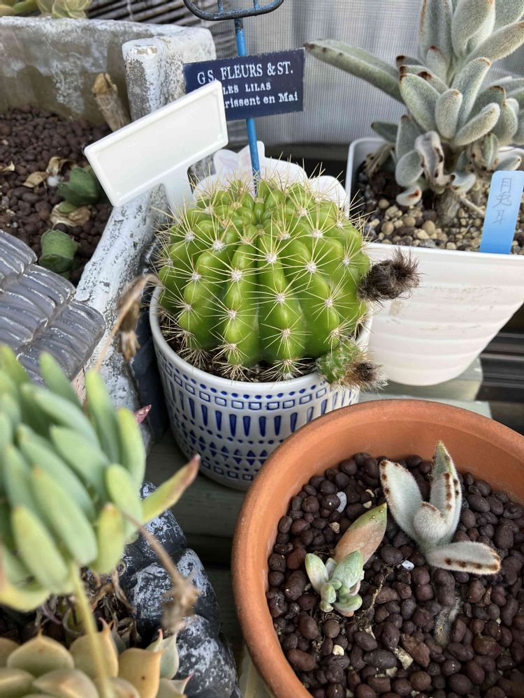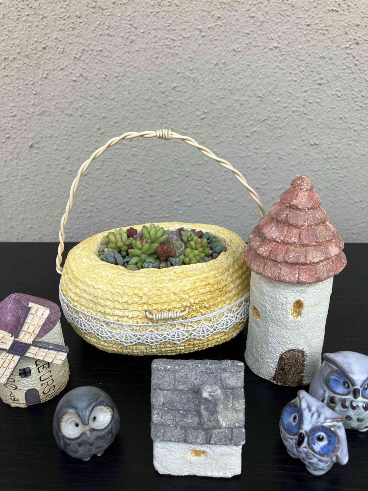 おはようございます。先日作ったカゴに家にあった多肉種を入れました。小さな🏠は色塗りをしました。2 .3は小さいものを選んで植え替えしました。4 孫から貰ったサボテンにお花の蕾かな?出て来ました😃