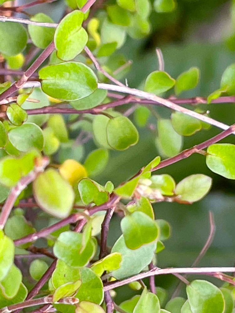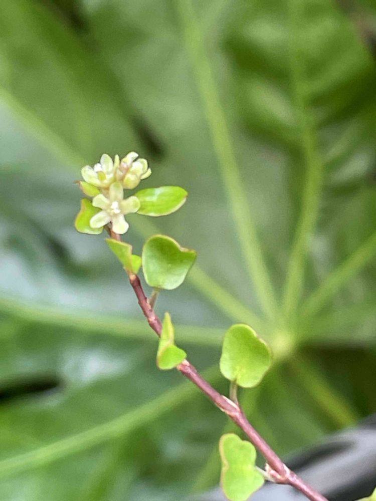 2024-6ー7(金) ワッ❣️ 😲💡初めて 小さい庭で見つけた ワイヤープランツの花〜 バックのヤツデの葉との対比🤣 と花芽