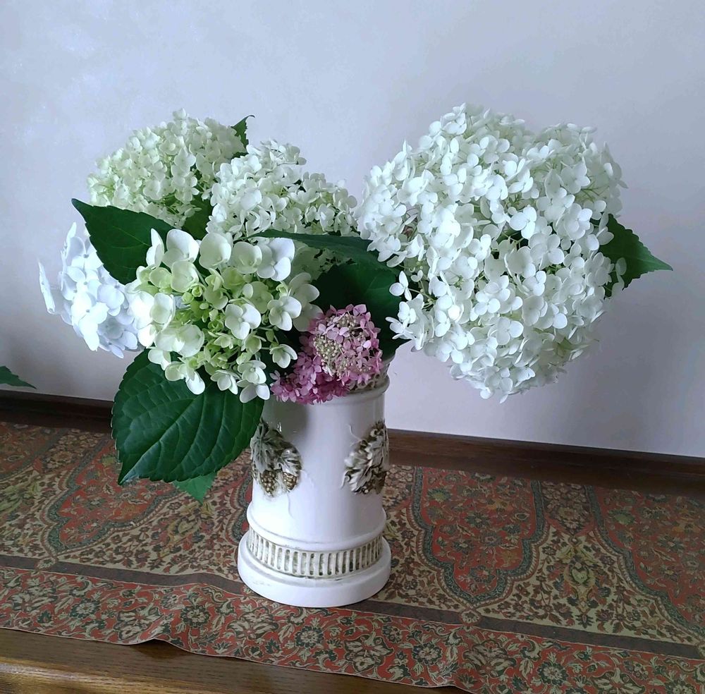アジサイの水あげを良くする裏技をテレビでやってたので、実行してみた…が、アナベルには通用しないみたい。すでに1本脱落、明日まで持つかな〜?普通のアジサイは大丈夫そう。