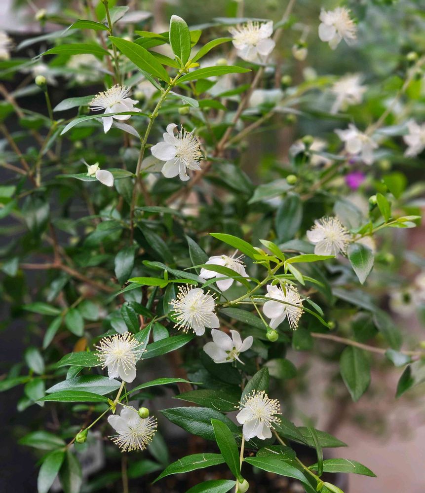 おしべが花火のように広がる 梅に似た美しい白い花を咲かせることから 和名を銀梅花(ギンバイカ)あるいは銀香梅(ギンコウバイ)と言います。