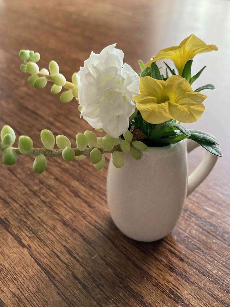 ずっと水挿し育ちの玉つづりに、季節の花をピンチして捨てるのもったいない小さいコたちを同居させることにしている