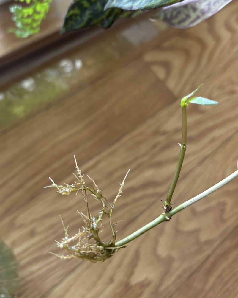 水挿しで根っこは出てきたもののなんの動きもなかったのですが、なんと新芽と新しい枝分かれが伸びてくれました〜〜〜🥳🥳🥳