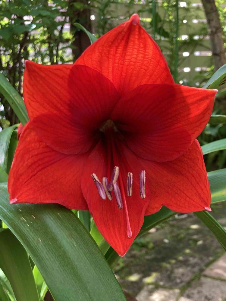 アマリリス レッドライオンが咲きました。花茎が20センチしか上がってなくて、水が不足していたのかも。