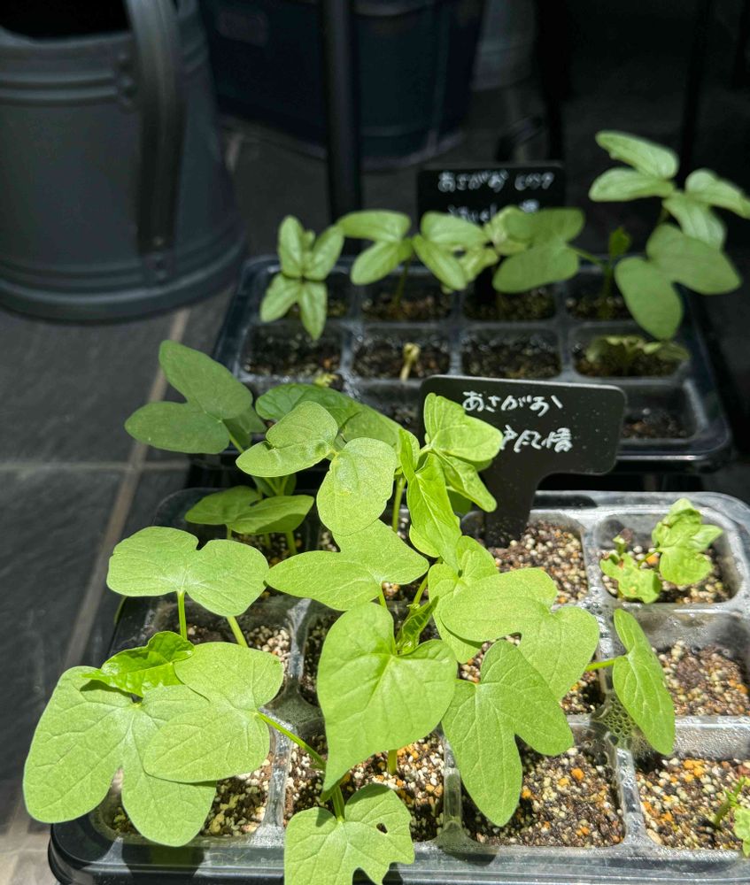 西洋朝顔の方はもうツルが伸び始め、支柱を立てました。毎年恒例の種類ですが、ご近所さんからも楽しみにされているので、夏の朝顔は欠かせません。