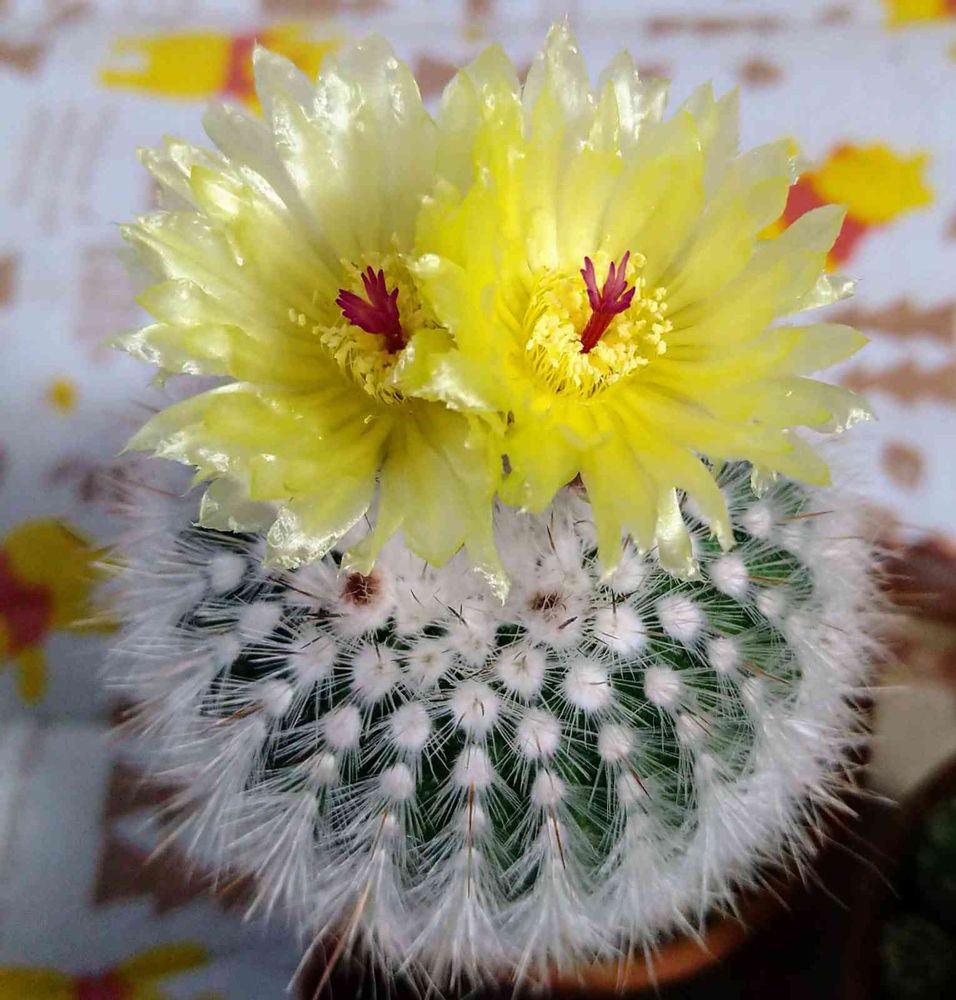 これは、まん丸サボテンの見事なお花。可愛さの二重奏ですね~。