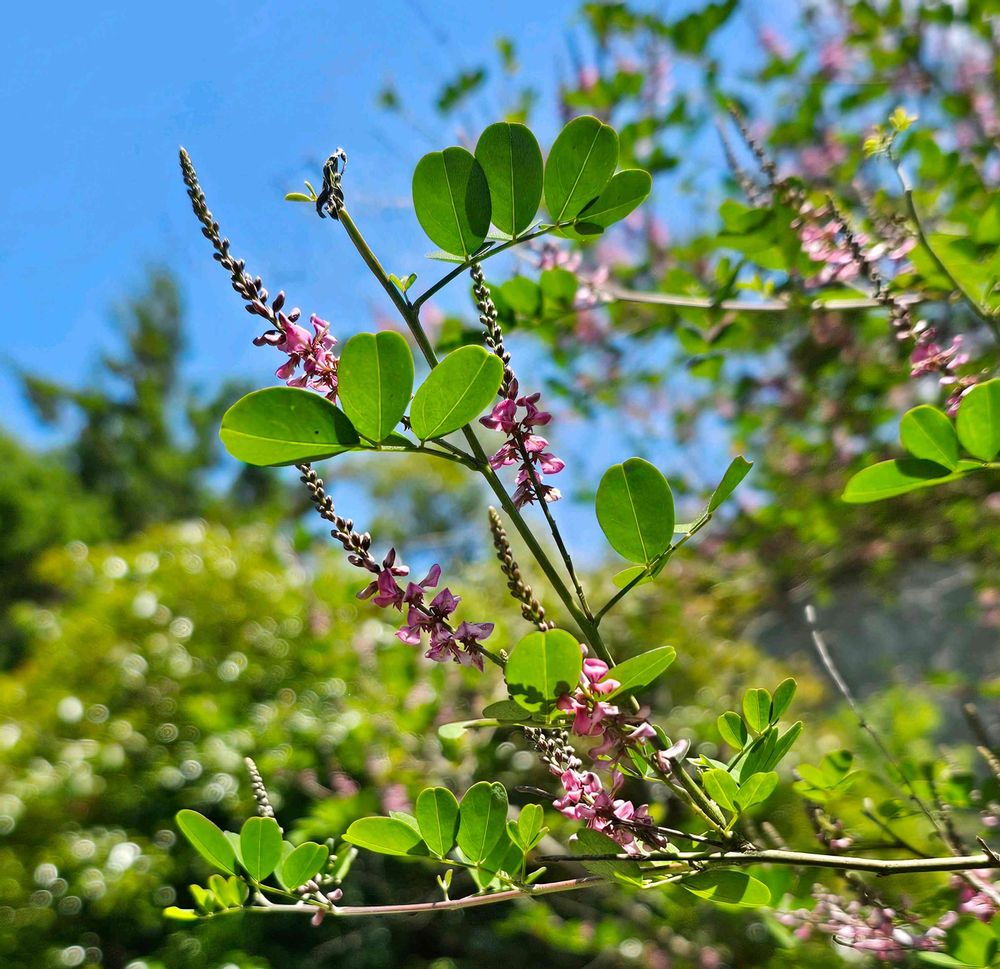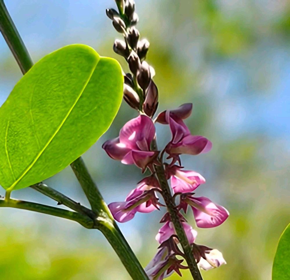 葉腋に長さ10cmほどの総状花序を伸ばし 淡紅紫色で長さ5mmほどの蝶形花をつけています