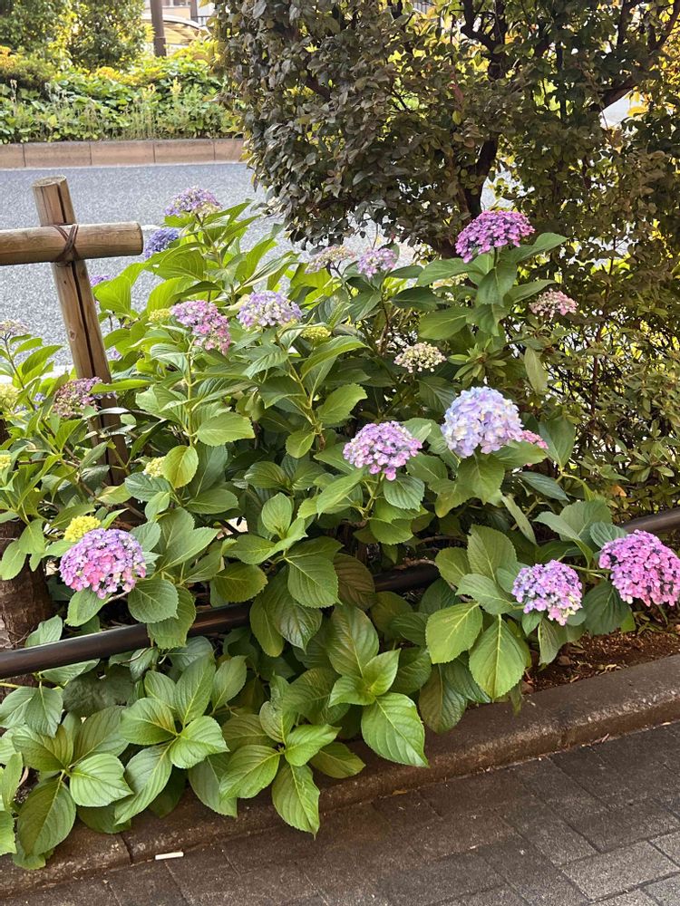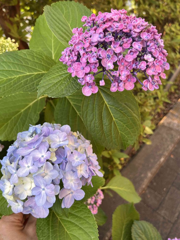 立派な紫陽花に成長しています。不思議なのは、先祖返りか違うタイプの花も咲き出しました🧐
