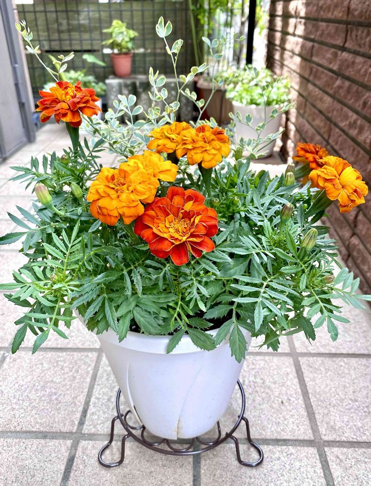 7号のスリット鉢にマリーゴールドさん2株と春の寄せ植え解体後のコロニラバレンティナバリエガータさんを植え付けました❤️🧡