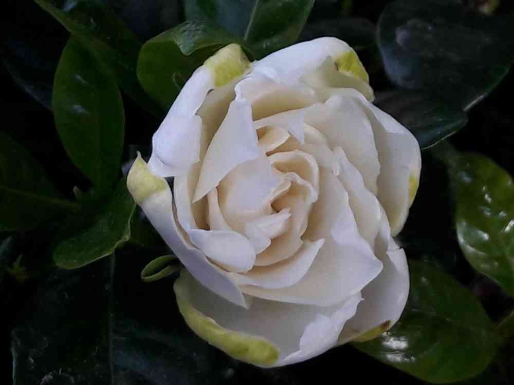 まだ開いたばっかりで、外側の花弁の縁が緑掛かって見えます。