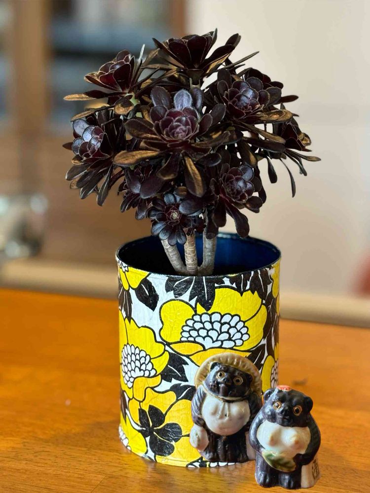 リメ缶に こういう柄だと 多少のシワは気にならなくていいわよね😆