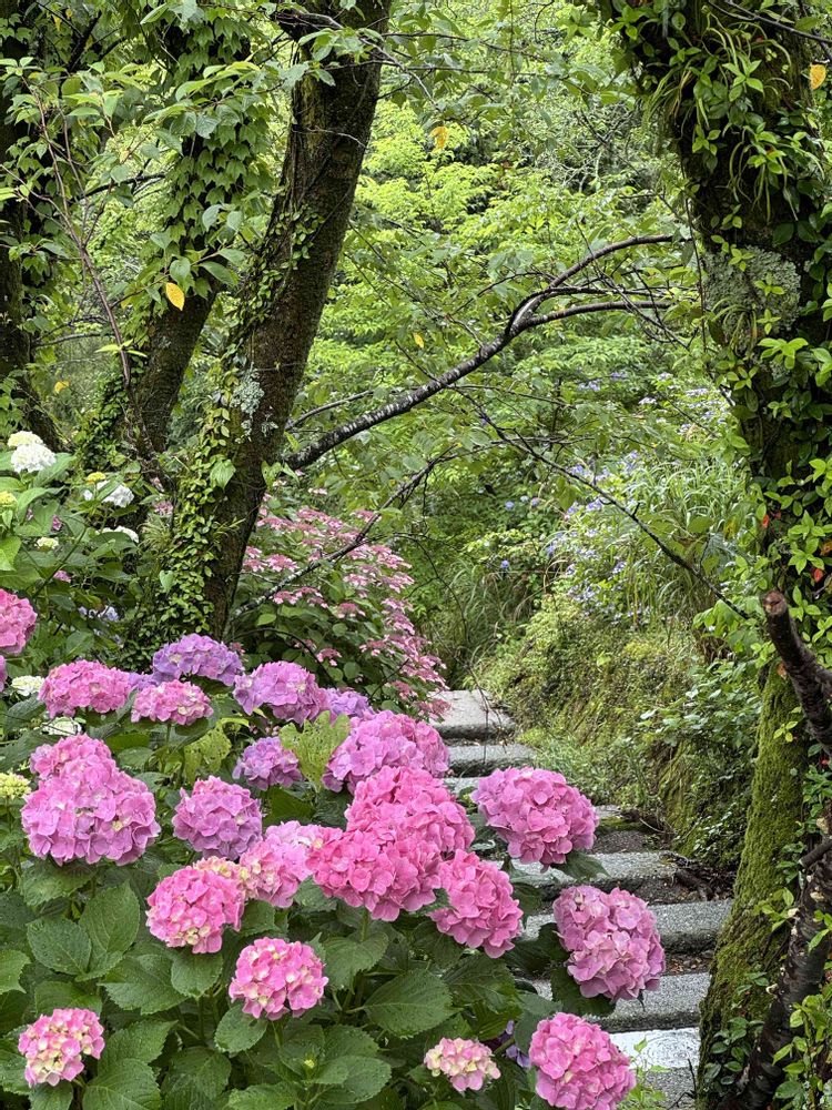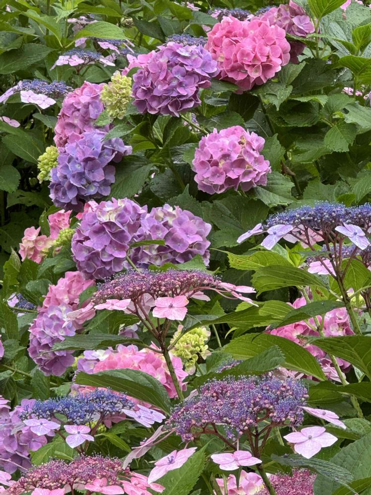 紫色、ピンク色、ガクアジサイ等の色とりどりの紫陽花が鮮やかで、とても素敵です。