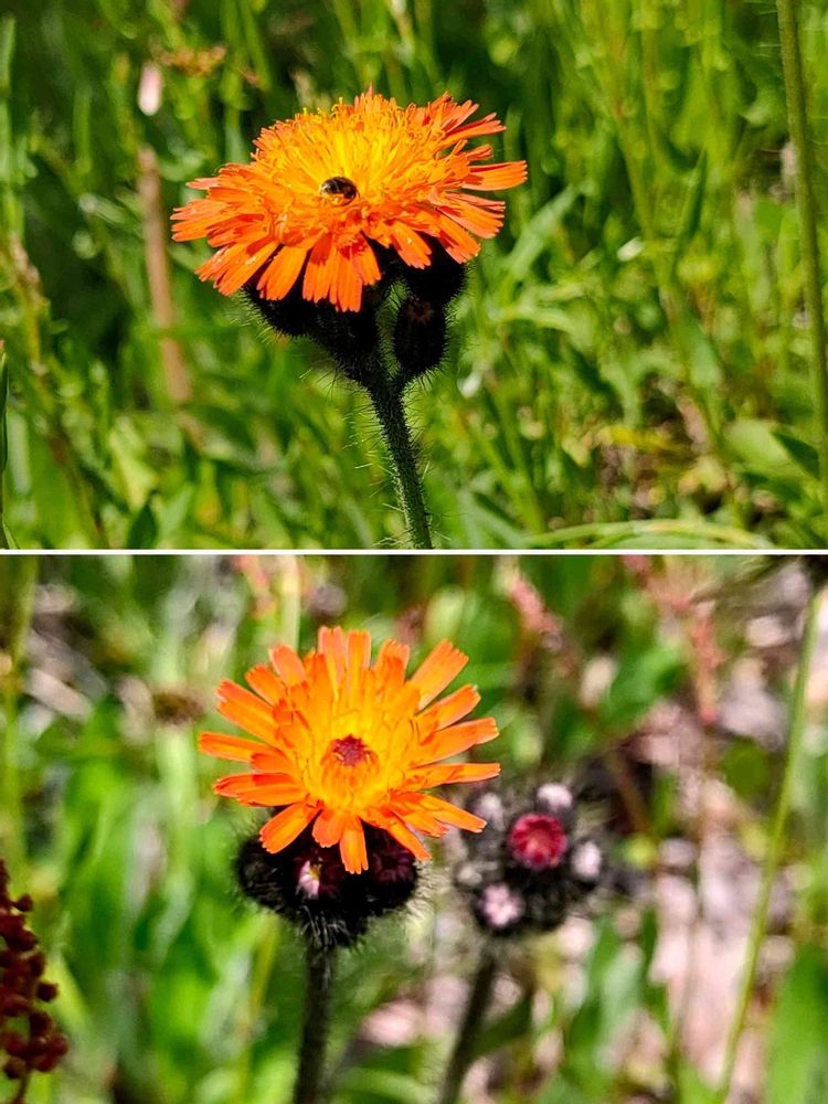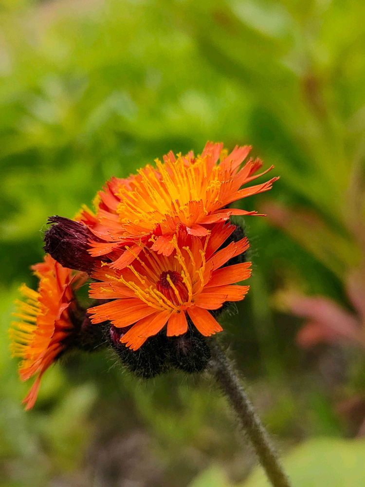 ✽頭花は径2cmほどで橙赤色の舌状花のみからなり、総苞片には黒い毛が多い