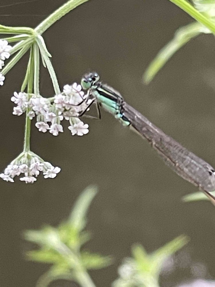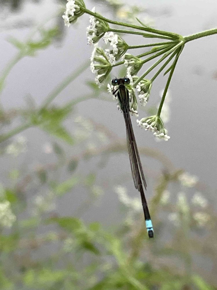 水辺に咲いているヤブジラミの花で、アオモンイトトンボが休憩中。昼間は暑かったからね☺️