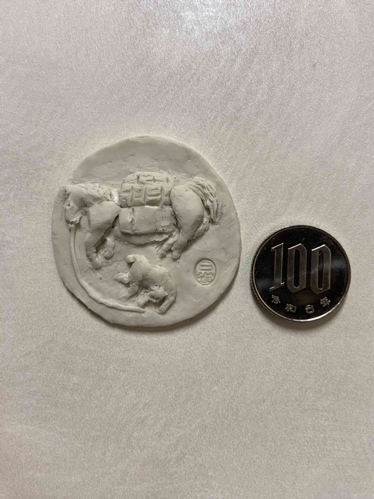 一週間後に、石膏の型に鉛を溶かして流し込んで完成(金属コイン)