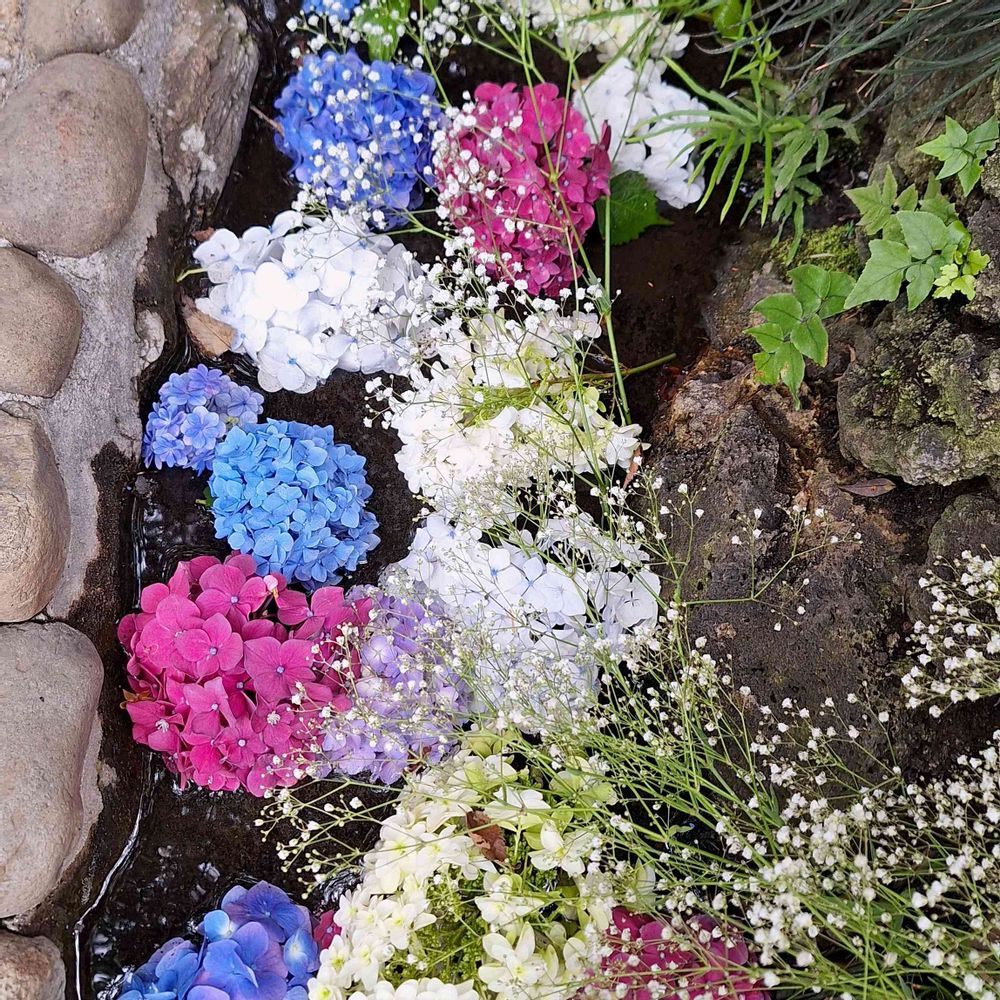 カラフル紫陽花、鮮やかな赤い欄干❤️…