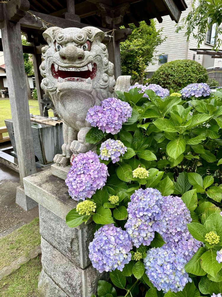 狛犬が、イイ感じに紫陽花とコラボしてました😍