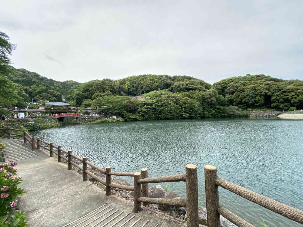 丘を上がるとダム湖になってまして通り道に紫陽花の鉢植えが迎えてくれました 夜はライトアップもあるようです