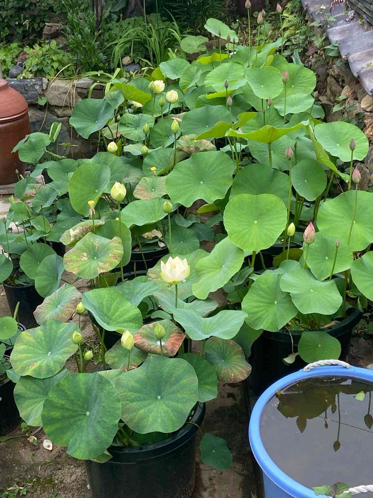 今朝の庭の茶碗蓮、黄蓮が4輪咲いています。