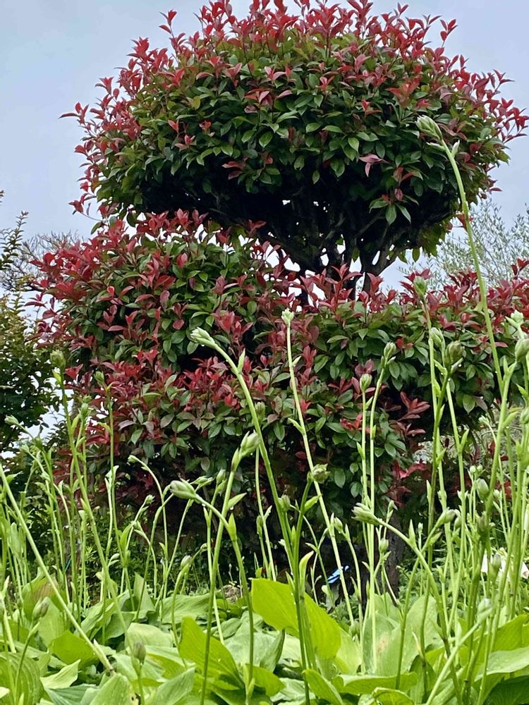 カナメモチの葉が赤くなり、サンパラソルも咲き始めました。