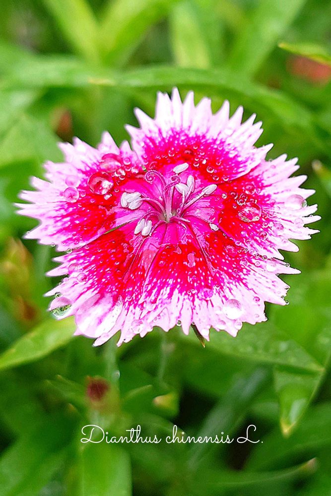 ⑤水切れさせ切り戻したセキチク、復活しました〜🙌上向きに咲く花は雨粒撮りやすい💧🌼🌿😂