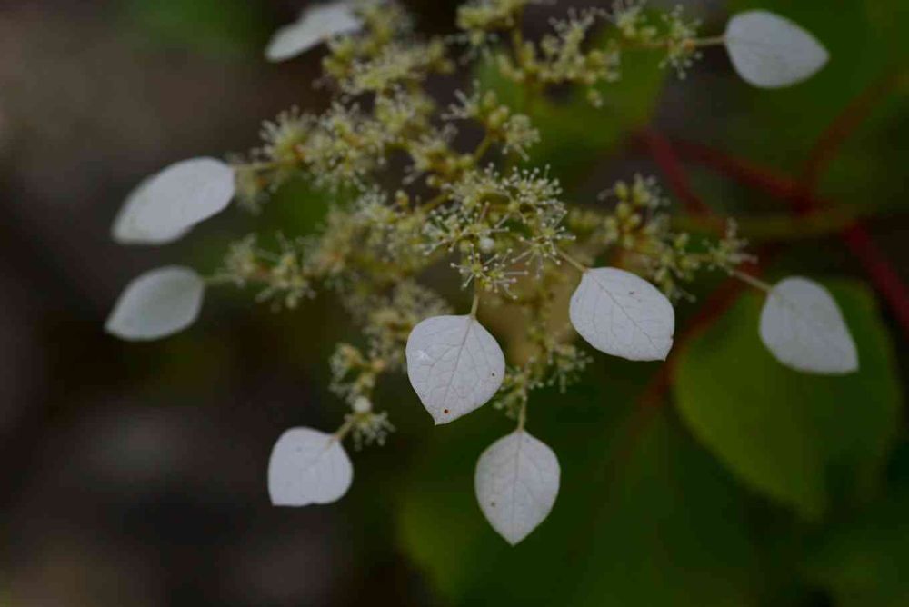 新種のガクアジサイかと思ったら、山地の岩崖や林縁に自生する、イワガラミという在来種で、つる性のアジサイの仲間だそうです。
