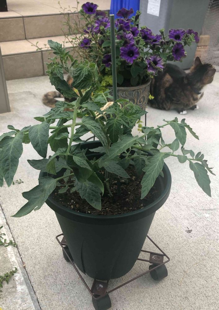 二枚目トマト🍅。どうも肥料過多のようで葉が丸まってしまいました。