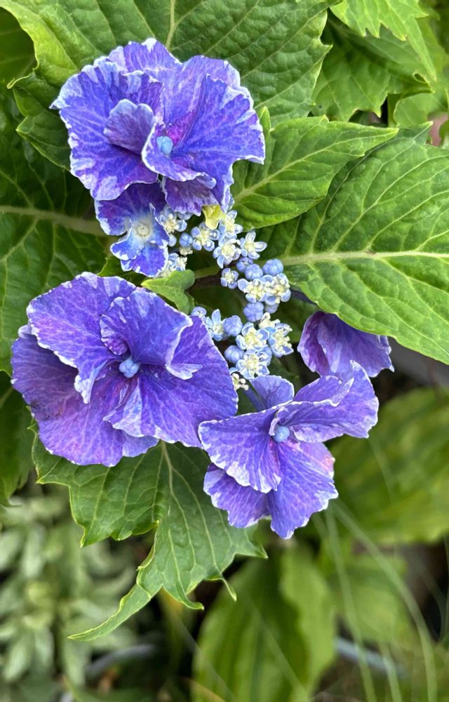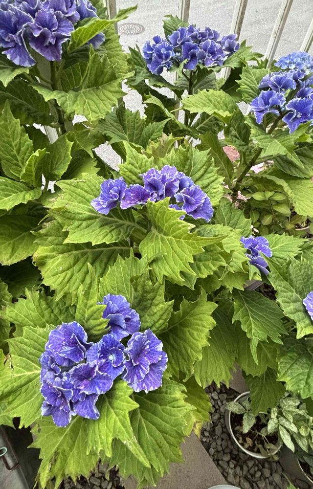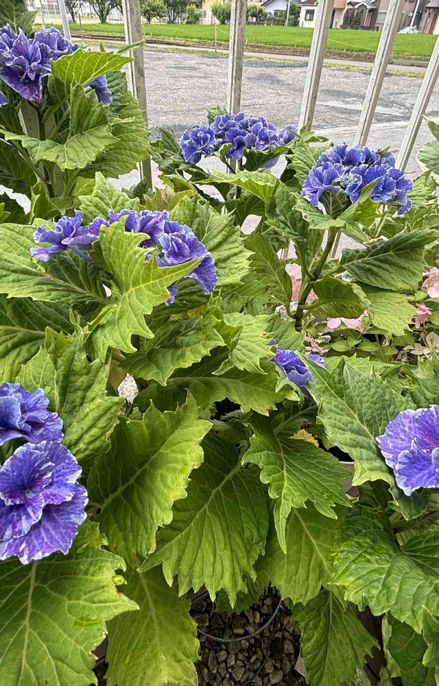 そんな期待をせずとも紫陽花ながらこの藍色は毎年変わらず、厚めの和紙のような質感、葉も厚めでシワ感がある紫陽花です。