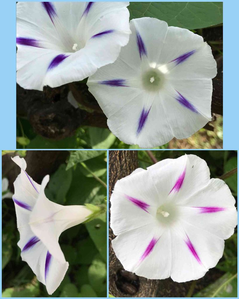 ①ついに今季の朝顔ミルキーウェイがみかん畑で咲き出しました。甘夏の木に絡みつくように〜😅💦