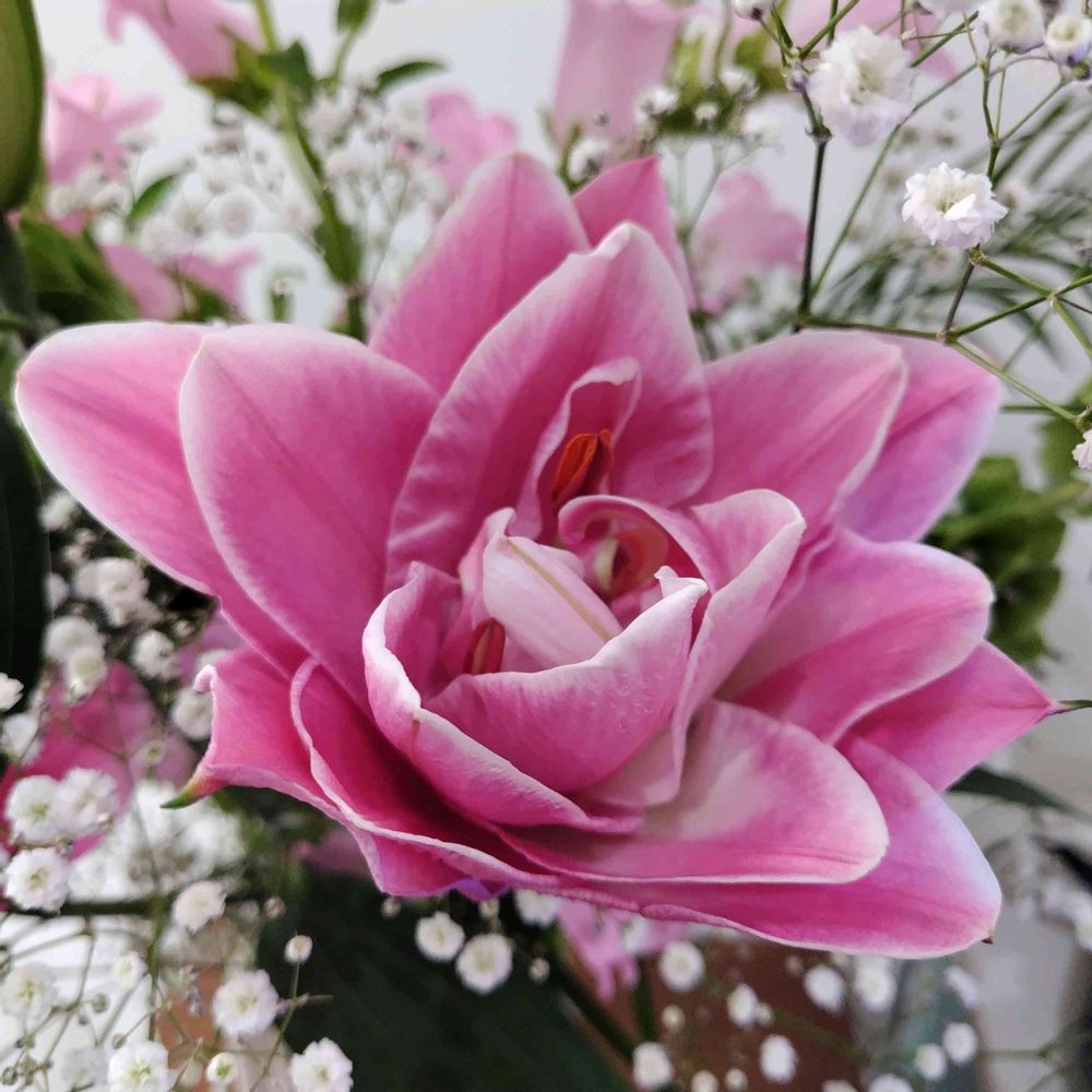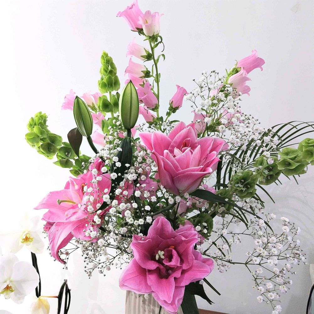 ユリとカンパニュラ・・・、同じピンク色の組み合わせ素敵です🥳