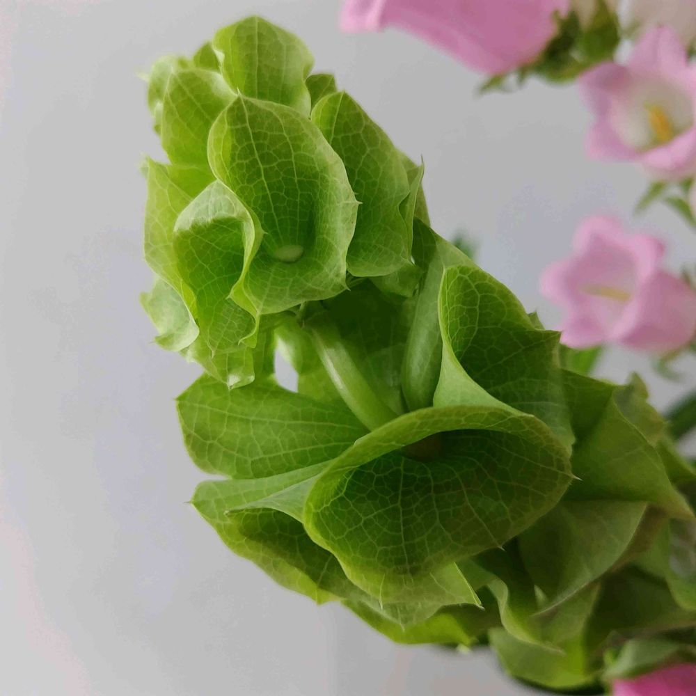 今週の花材は。カンパニュラ、ドラセナ、モルセラ、カスミソウ、ユリです✨