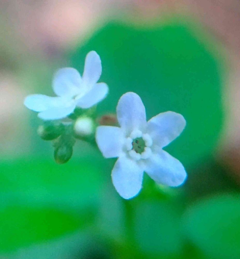 花冠喉部の付属体は白色♡花は5裂、ガクも5、奥まったところになんとか見えている雄しべも5(1、2枚目)だけれど、果実は三角錐のような4分果∇💚(3枚目)