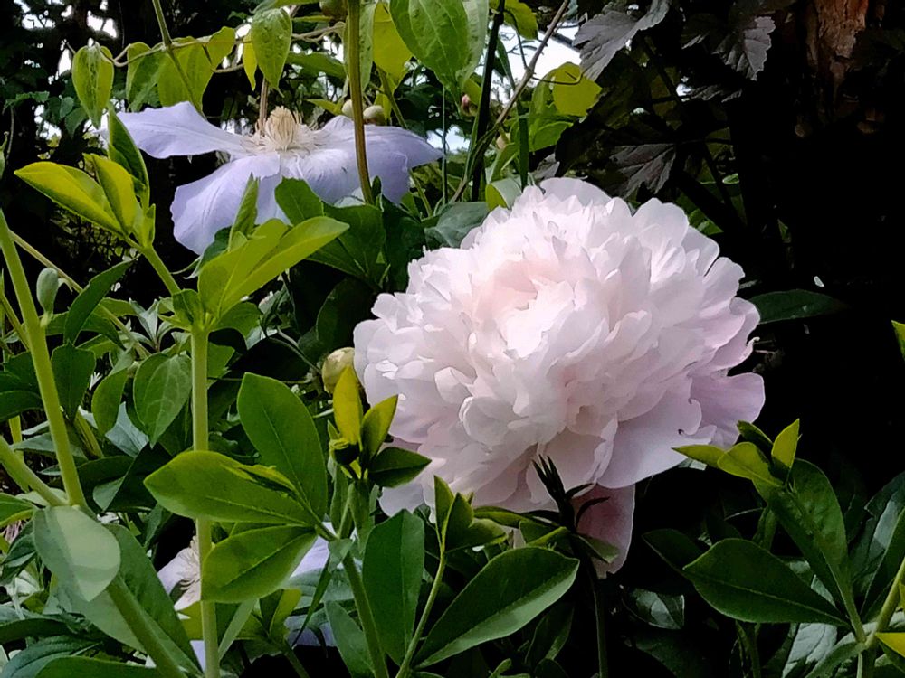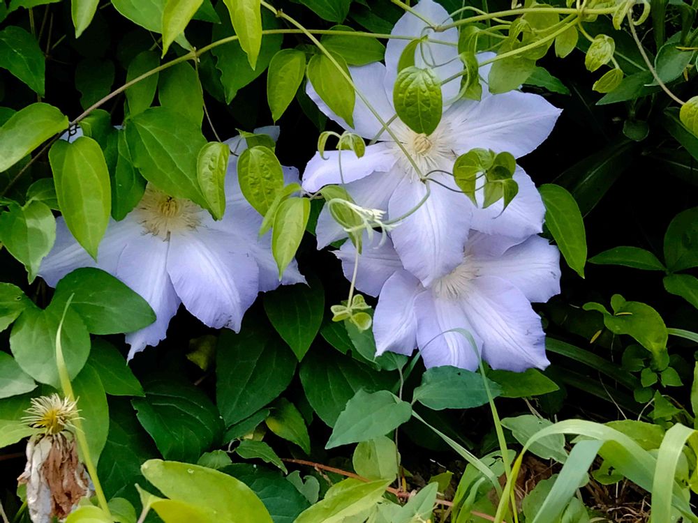 クレマチスは零れ種からで、毎年勝手に生えて勝手に銅葉のシモツケ、ディアボロに絡まってます