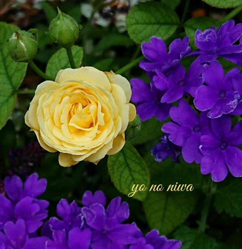 鉢植えの🌹ボーダー💛ちゃんにこれまた鉢植えのバーベナ💜さんを押し付けて(笑)😂💦Σp[【◎】]ω・´)パチリ~酷いカメラマンです(笑)