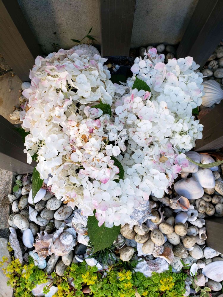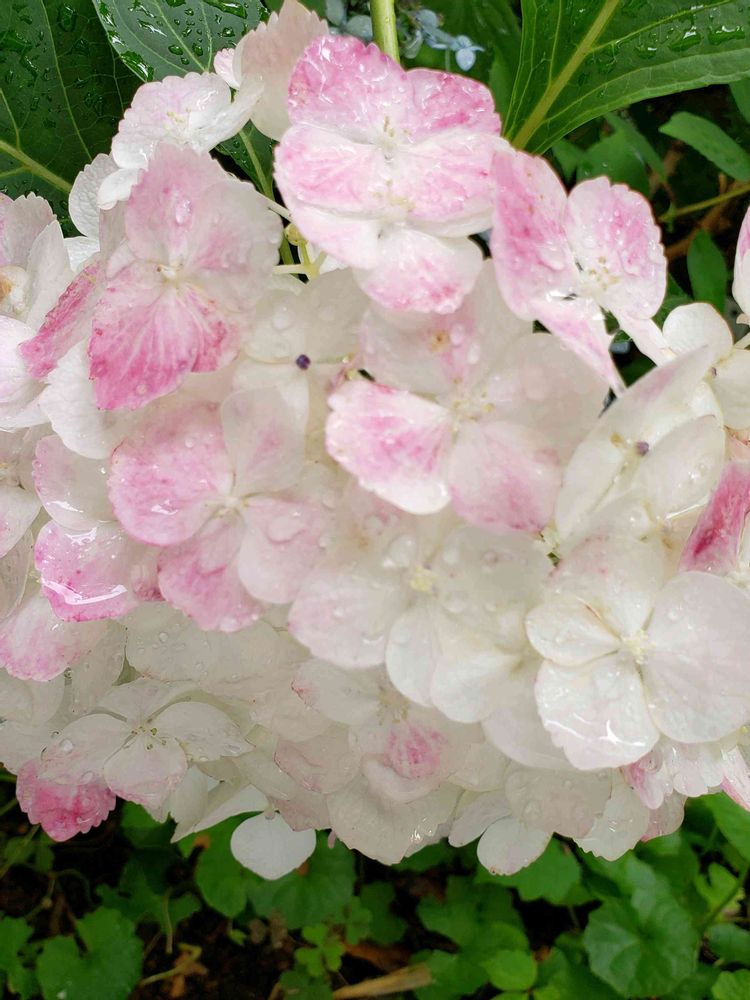 アジサイ 天使のほっぺは真っ白から徐々にピンクが入り、そしてさらに水色に色変わりするアジサイです。