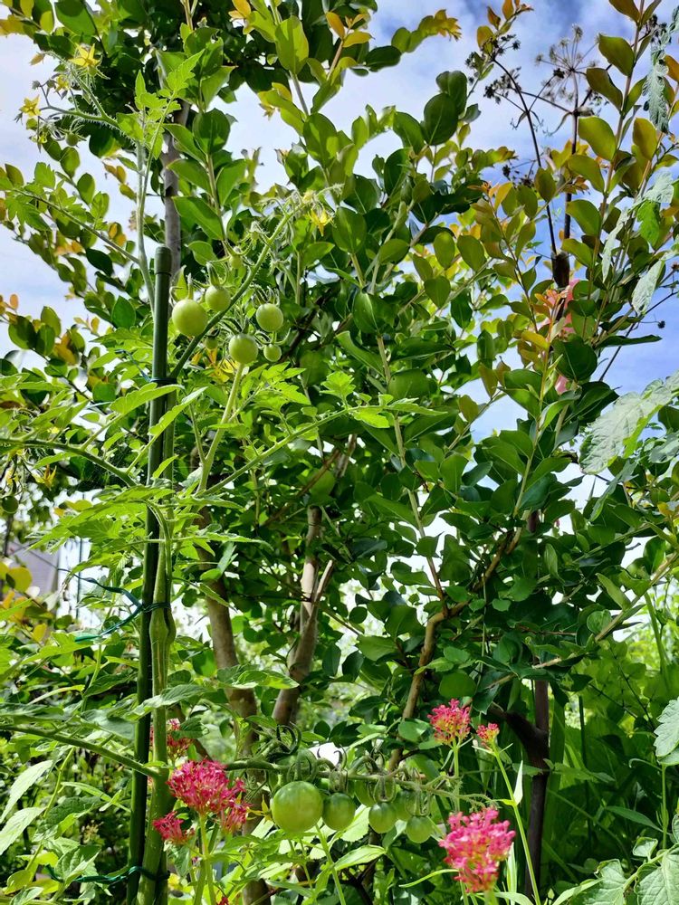 暑い。眩しい。家庭菜園。ナス、ミニトマト、ミニトマト、こぼれ種からのエンダイブ(花)。ミニトマトは大量に実っているので、赤くなるのに2週間くらいはかかるかな、という感じです。ナスは今年は本当に上手くいってます。初期成長用に混ぜた肥料と米ぬか大量!がよく効いたみたいです。