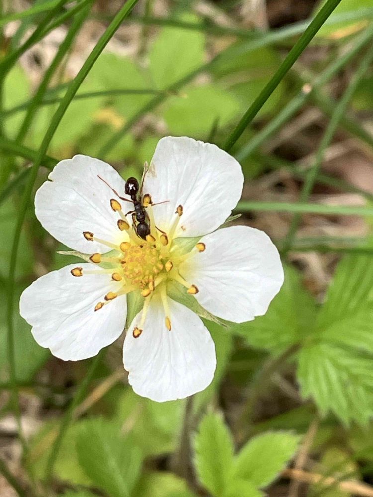 シロバナノヘビイチゴです。ヘビイチゴと名乗ってますが仲間ではなく、見た目も栽培してるイチゴの花に似てますよね。この花は栽培種の元祖オランダイチゴに近い野生のイチゴです