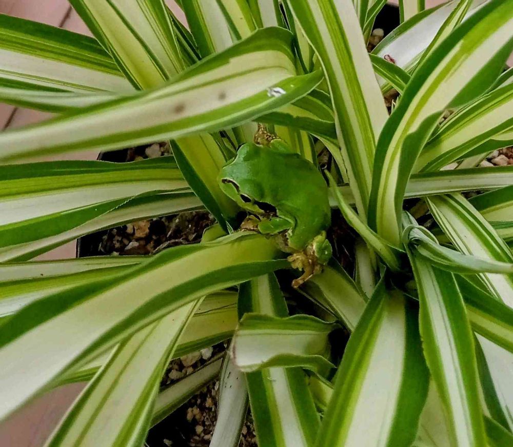 🌱✨オリヅルランのグリーンはカエルちゃんと同じ色で隠れやすい🤭密かに隠れてるかもよ🤣✌️🐸✨