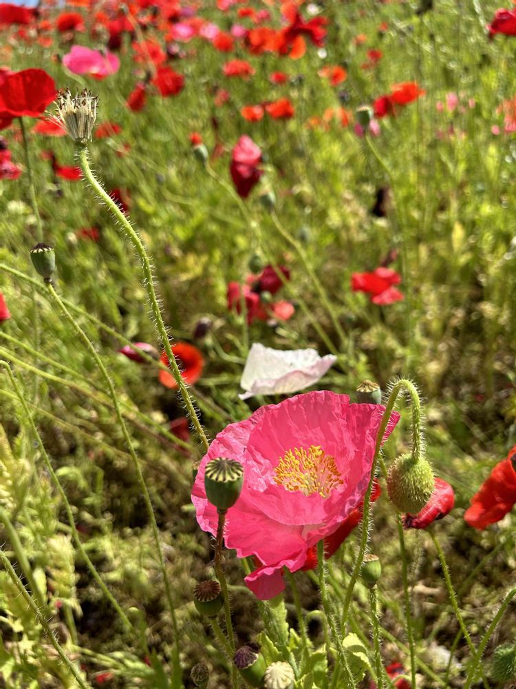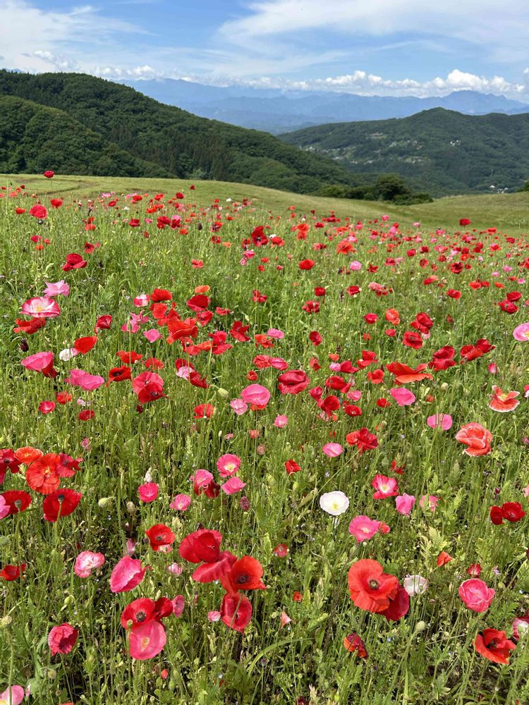 翌日は雨予報のため1日早く最終日となった今年の秩父の天空のポピー畑。主催者スタッフは例年の1割も咲いてない😢と嘆いていました。入場料を例年500円→200円に値下げするほど。でも絶好の天候☀️で遠くに見知らぬ山々を背景にした花の丘❣️大満足でしたよ💮