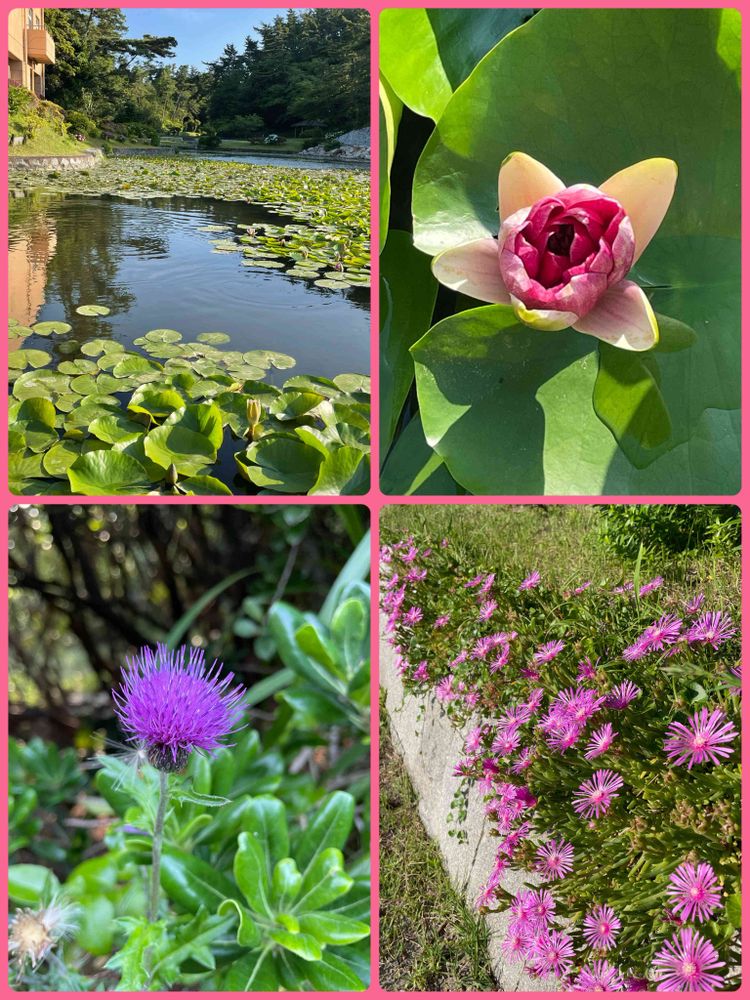 ②池のスイレンはまだちょっとだけでした💦アザミちゃんとマツバギク♬