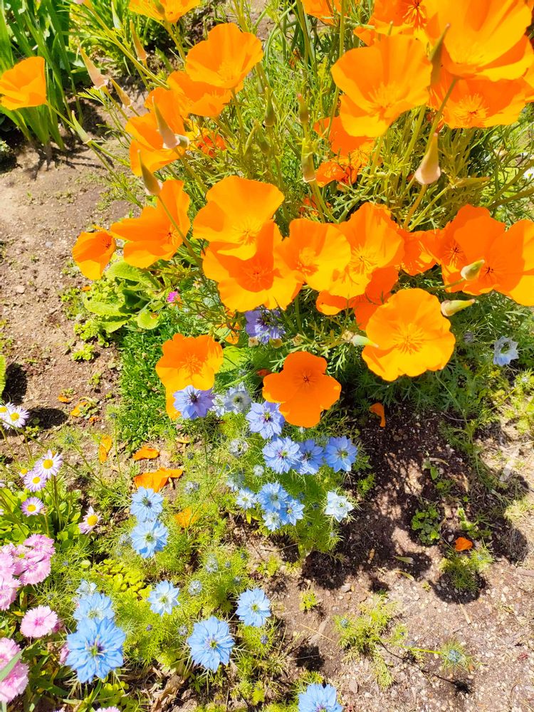 💛色のハナビシソウと、💙🩵色のニゲラさんです。🥰
