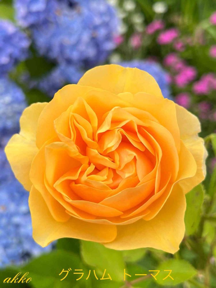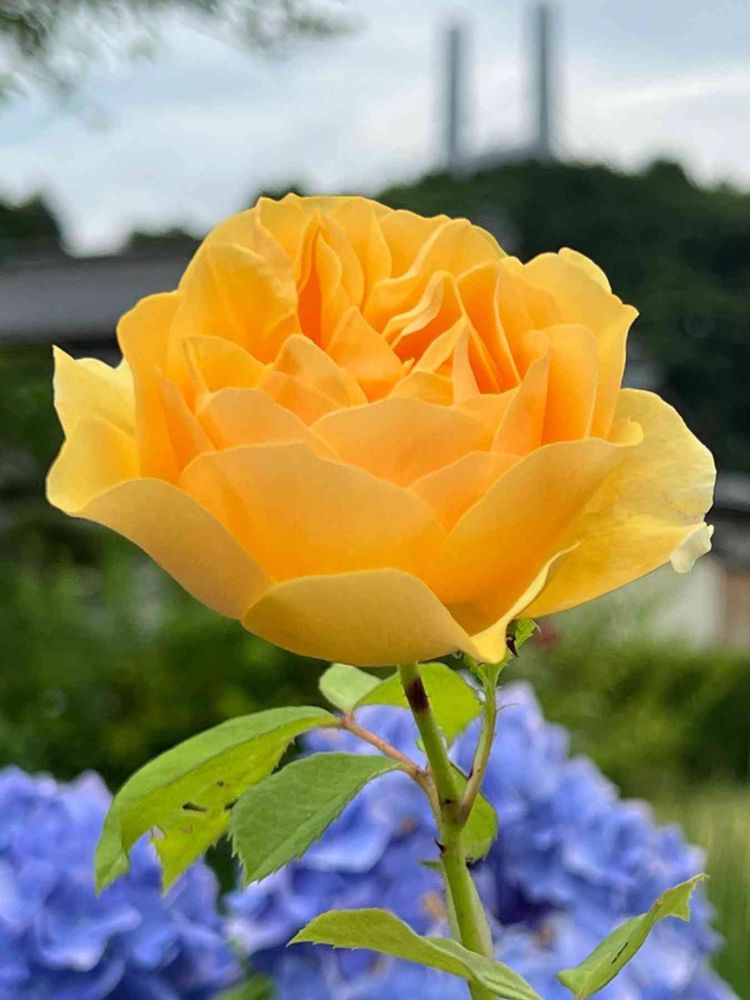 春バラの最終一輪が紫陽花のそばで綺麗に開花